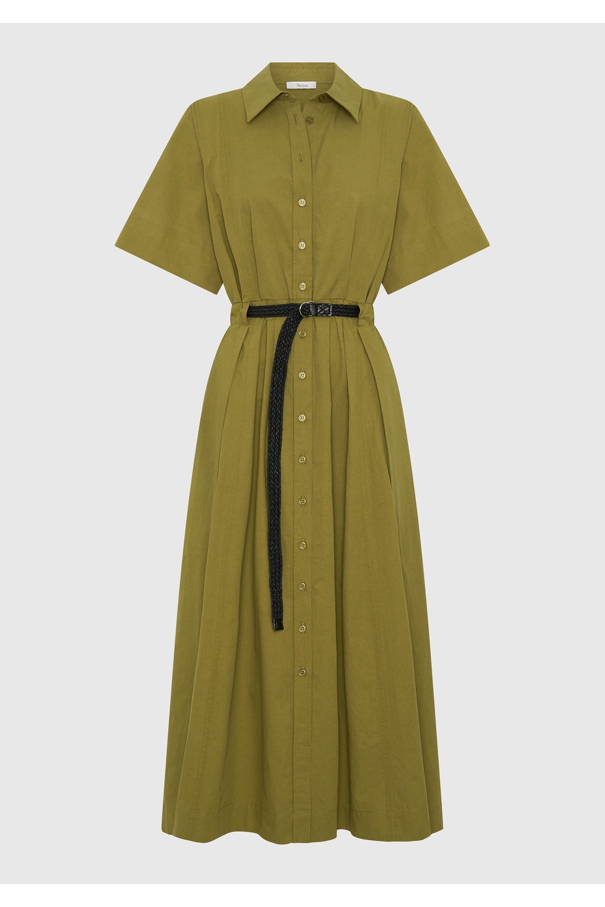 Crafted in cotton twill, the Ingrid Shirt Dress combines structure with ease. A traditional collar, button front, and tailored bodice create polish, while short sleeves and tunnel waist detailing add interest. Finished with an A-line midi skirt and contrast belt, it’s a versatile piece for everyday or occasion wear.