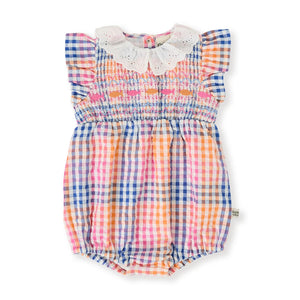 Smocked to perfection and printed with rainbow checks – this fresh Flo Dress is ideal for twirling, wandering, and Very Serious Shell-Collecting.