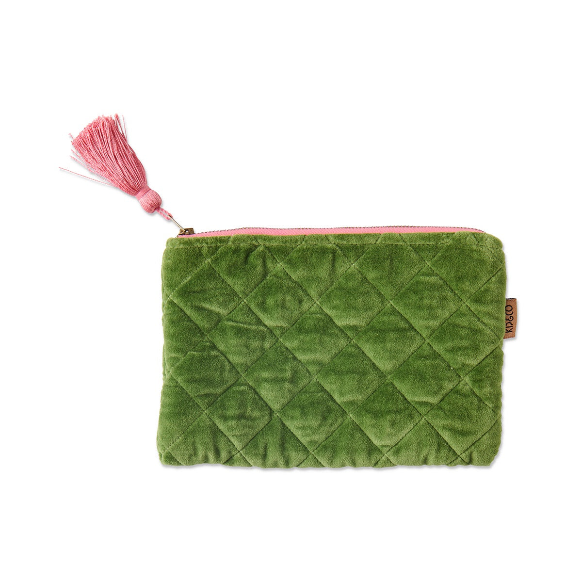Quilted velvet cosmetics purse with zip closure and features tassel.